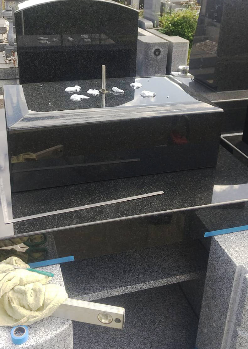 墓石と墓誌を黒に近い濃い灰色の色合いのインド産 山崎石でおつくりしました。